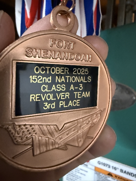 Fall Nationals, October 2025 Revolver Team, Class A-3, third place, EJ Dammer, Matt, Brian Brian 25 yard revolver, first place, sharpshooter class